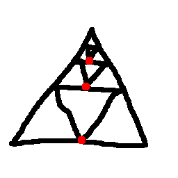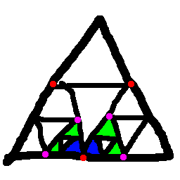 What do we mean by sufficiently well distributed? Suppose we want to move around the three red dots in the picture below. Consider the bottom dot. It would be allowed to range over the blue area, and the determinant would stay bounded from zero. If the dot were allowed to vary into the green area (as the other dots were going similar things) but not onto the pink points, then the determinant would stay non-zero, but get arbitrarily close to zero. This concept is easily extended to lower levels of the gasket.